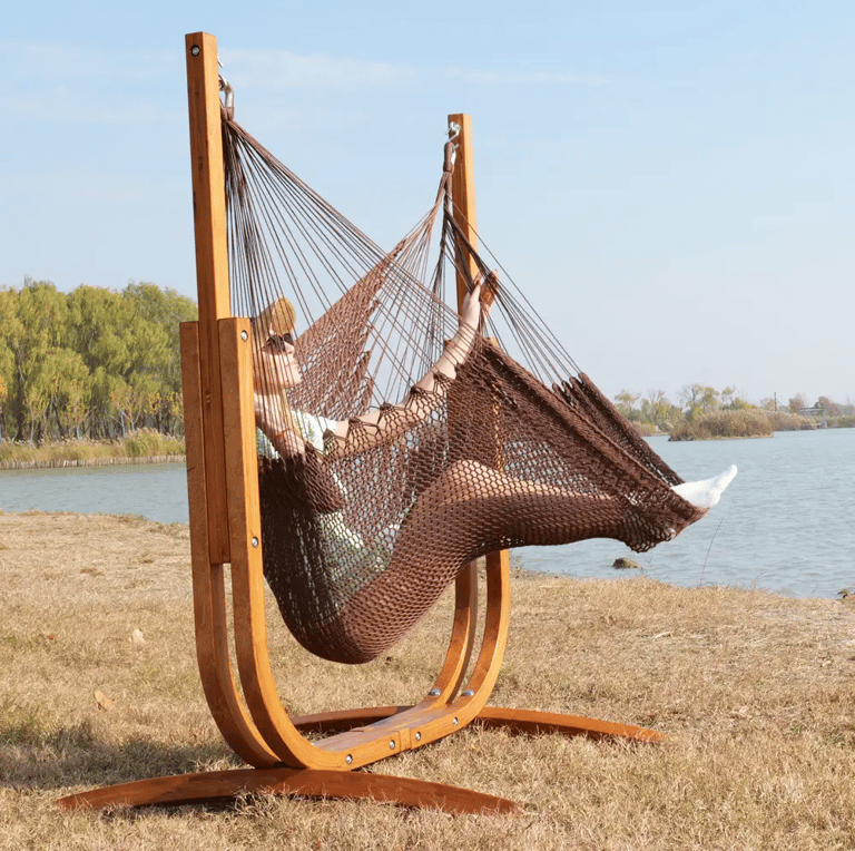 Caribbean Rope Hammock Chair with Wooden Stand, Rich Mocha Rope Color, 400 lbs Capacity, U-Shaped Hammock Stand for Indoor Outdoor Use, Patio Garden Backyard Porch