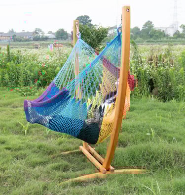 Where Caribbean ease meets interior harmony: a freestanding hammock chair built with natural wood and quiet elegance for modern interiors.