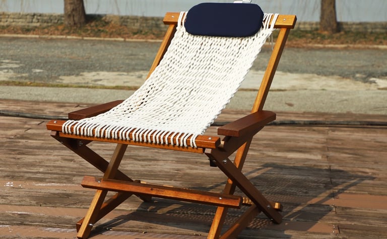 Experience ultimate relaxation with this beautifully handcrafted wooden folding rope rocker chair. The classic design features a comfortable poly-cotton rope weave that creates a naturally conforming seat, perfectly cradling your body as you unwind. The sturdy wooden frame includes convenient armrests and folds easily for transport, making it ideal for beach trips, camping, or backyard lounging. A removable optional colors headrest pillow adds extra comfort while the portable design allows you to take your relaxation anywhere. The natural wood construction paired with cream-colored rope creates a timeless aesthetic that complements any outdoor setting. Whether you're soaking up the sun or enjoying a peaceful evening on your patio, this rope rocker chair provides the perfect blend of style, comfort, and convenience. The folding mechanism makes storage simple when not in use, while the durable materials ensure lasting enjoyment of this versatile piece of outdoor furniture.