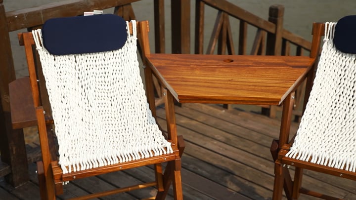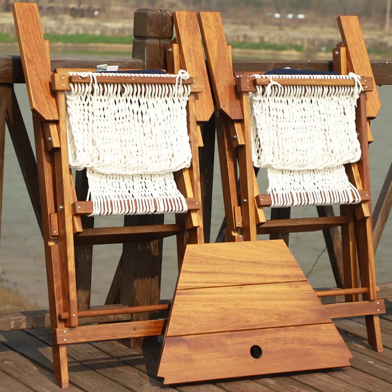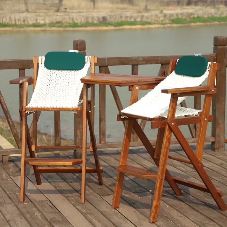 Crafted from solid iroko hardwood and UV-resistant woven rope, this folding barstool features a comfortable hammock-style seat, foldable design for easy storage, and a removable center Tete-a-Tete table with umbrella hole—perfect for balconies, patios, or lakeside lounging.